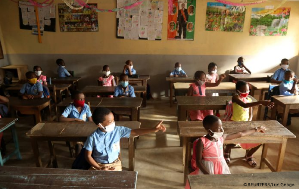 Photo Credit: Students, wearing protective masks, attend school at the Merlan School of Paillet in Abidjan, Ivory Coast, as the lockdown due to coronavirus pandemic (COVID-19) is eased. May 25, 2020. REUTERS/Luc Gnago